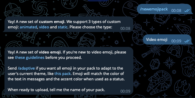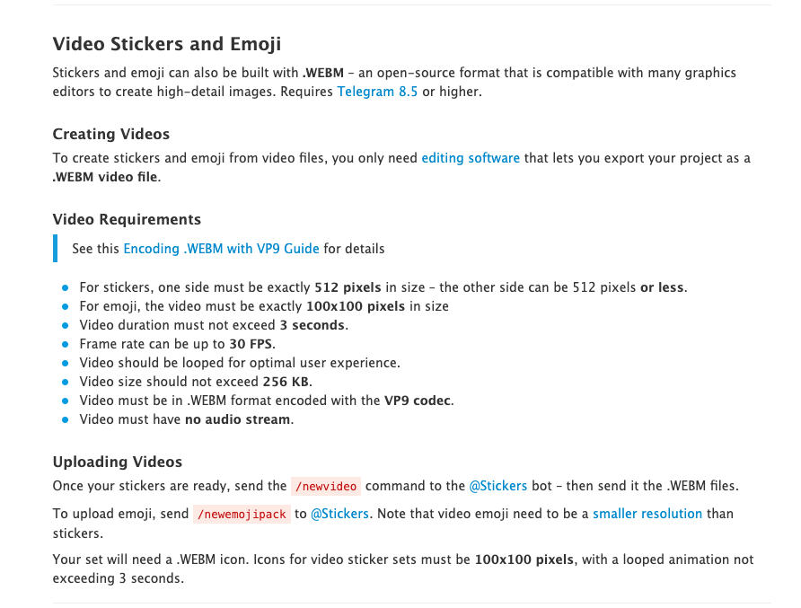 The requirements are pretty simple to obtain, just on Telegram’s webpage, there are extremely explicit instructions (LINK); Telegram supports three major types of emoji/stickers:
