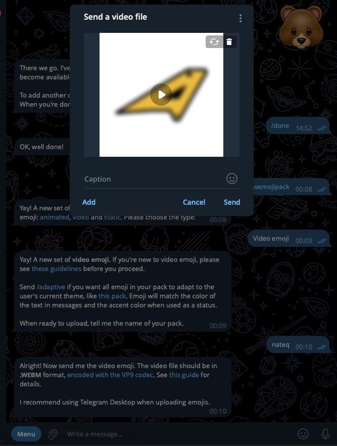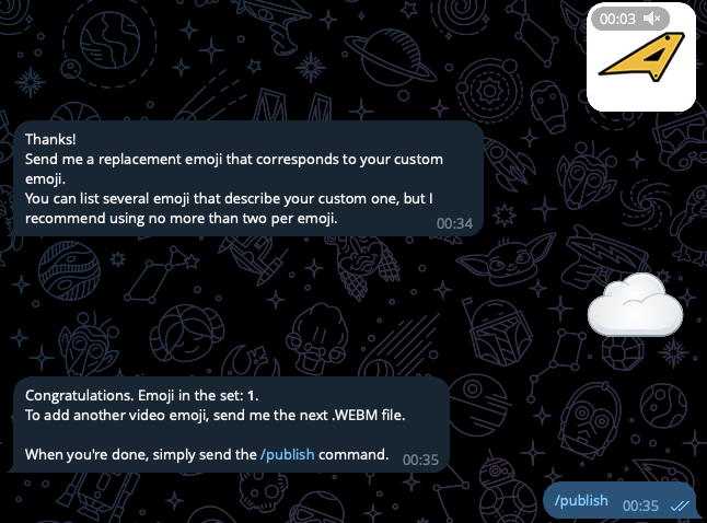 At this moment, Sticker Bot will request an emoji video.WEBM format, encoded using the VP9 codec, with instructions; here we pause and proceed to the next stages to create our own custom emoji.
