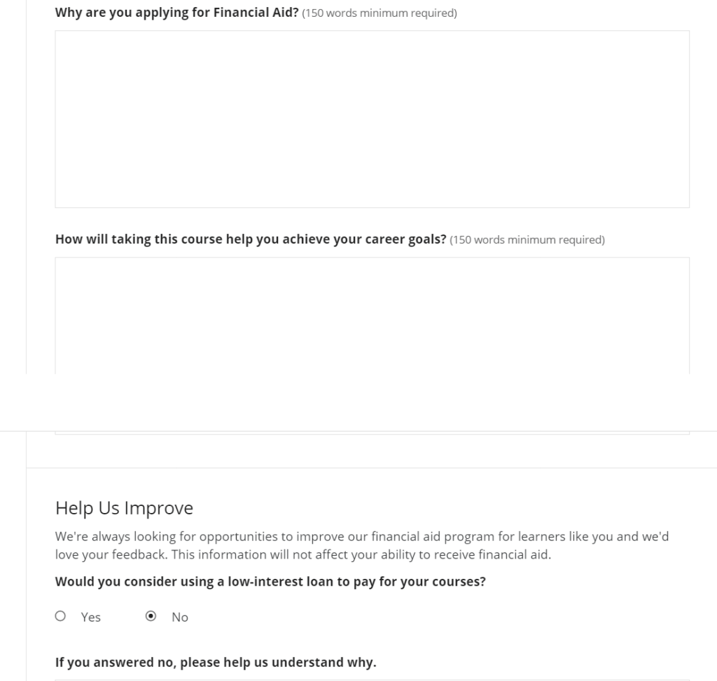 - Would you consider using a low-interest loan to pay for your course? (Yes/No). If you answer no, please help us understand why.