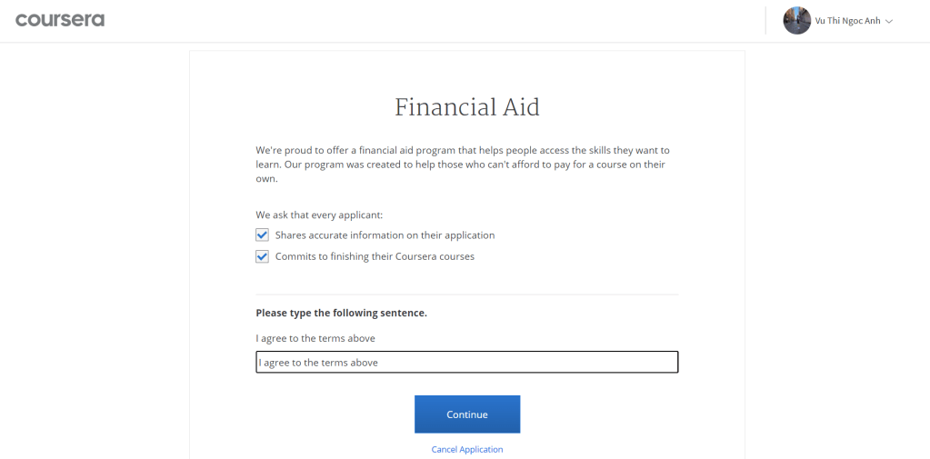 Không chọn audit free (chỉ xem miễn phí video bài giảng) khi bạn đã apply Financial Aid. Nếu không, bạn sẽ bị từ chối.