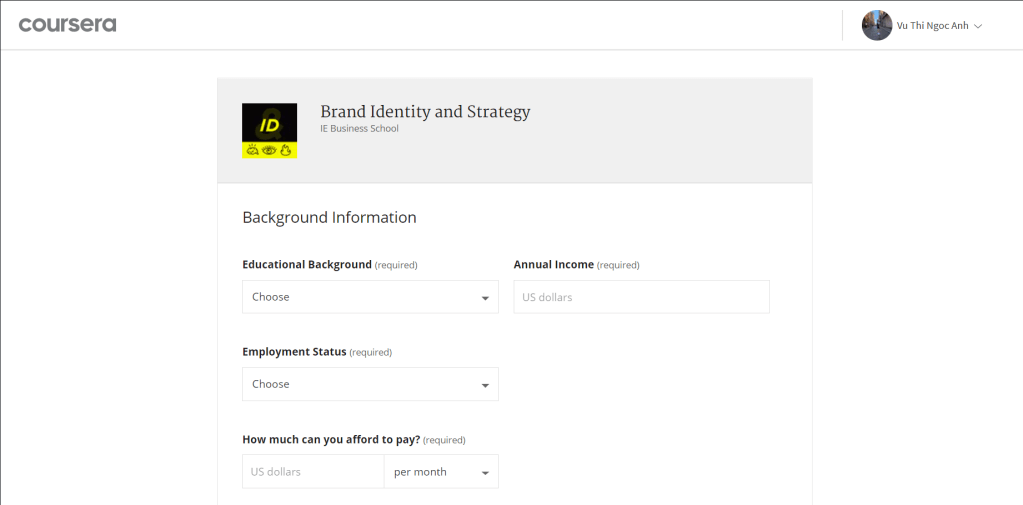 Về câu How much can you afford to pay, mọi người có thể để một khoản tiền nhỏ nếu muốn chi trả một chút học phí. Mình thì luôn điền 0$ và vẫn được Coursera đồng ý hỗ trợ 100%.