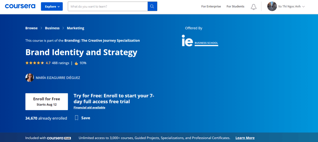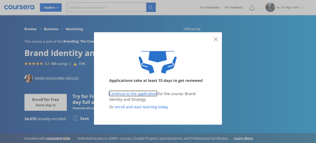 Đầu tiên, chọn khóa học bạn muốn rồi click vào Financial aid available (phần chữ hơi nhỏ ngay bên phải nút Enroll for Free).