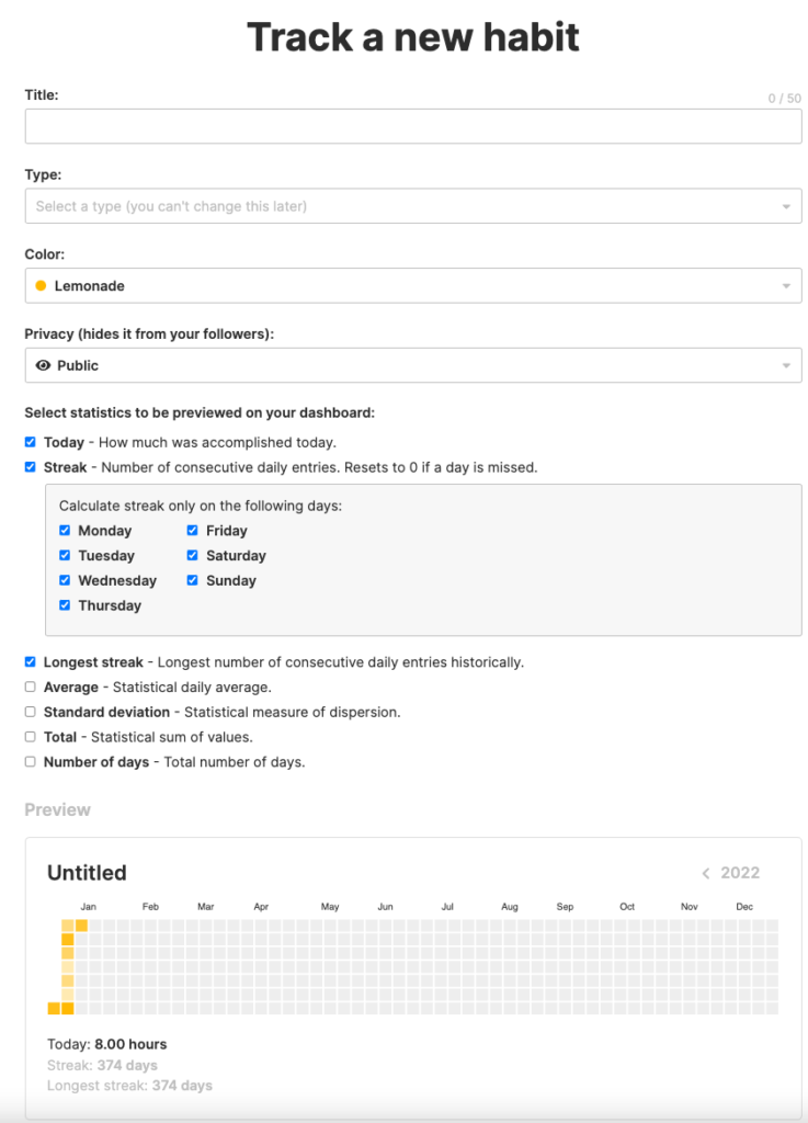 - Visualize các habit record của mình 1 cách trực quan và màu sắc phân đậm nhạt, tiện cho việc hình dung được thói quen của mình phân bổ như thế nào.