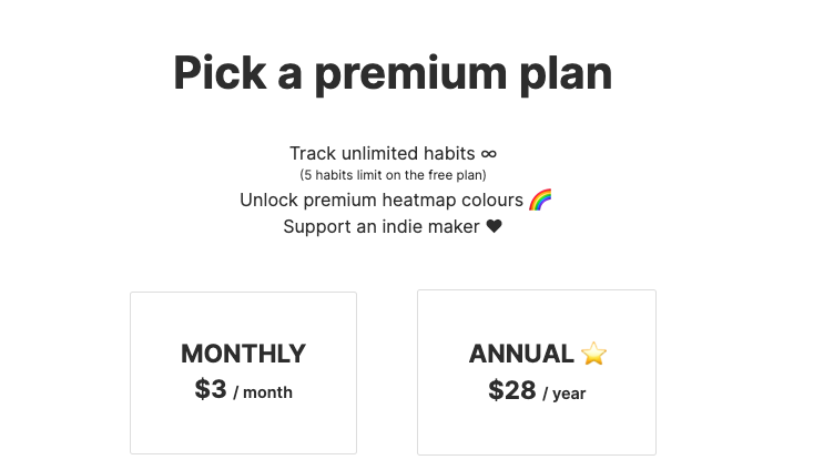 - Bản free chỉ được tạo max 5 bảng Habit Tracking + 2 màu cho heatmap, nếu có nhu cầu nhiều thì 3$/ tháng & $28/ năm là quá rẻ cho 1 ứng dụng hữu ích như thế này. Link ở đây: https://www.lifeofdiscipline.com/get-premium