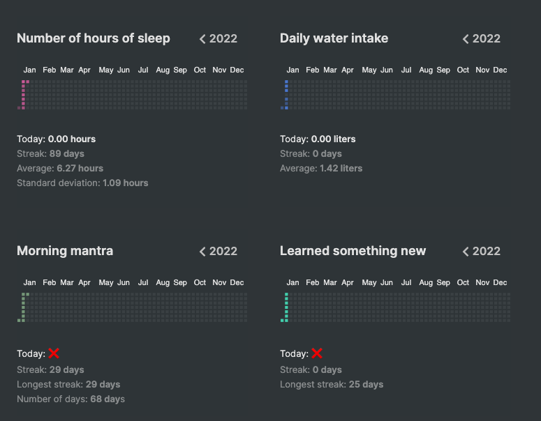 Vì vậy trước đó thì mình chủ yếu sử dụng app trên điện thoại để tracking các thói quen của mình, ưu điểm là nhanh-gọn-tiện lợi, nhưng lại phân mảnh, không kết nối được với Notion nên cũng còn lấn cấn.