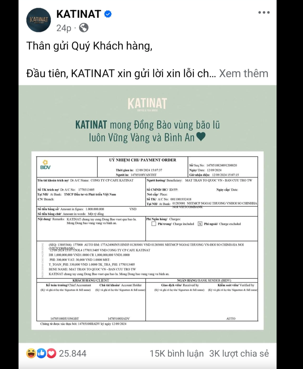 Trong tình hình cả nước đang hướng về miền Bắc bị ảnh hưởng bởi bão Yagi, brand đã có chương trình để ủng hộ bằng cách trích 1000đ trên mỗi ly nước bán ra, tuy nhiên, brand đã nhận nhiều ý kiến trái chiều xung quanh campaign này, bài thông báo đã nhận được số lượt react phẫn nộ rất cao.