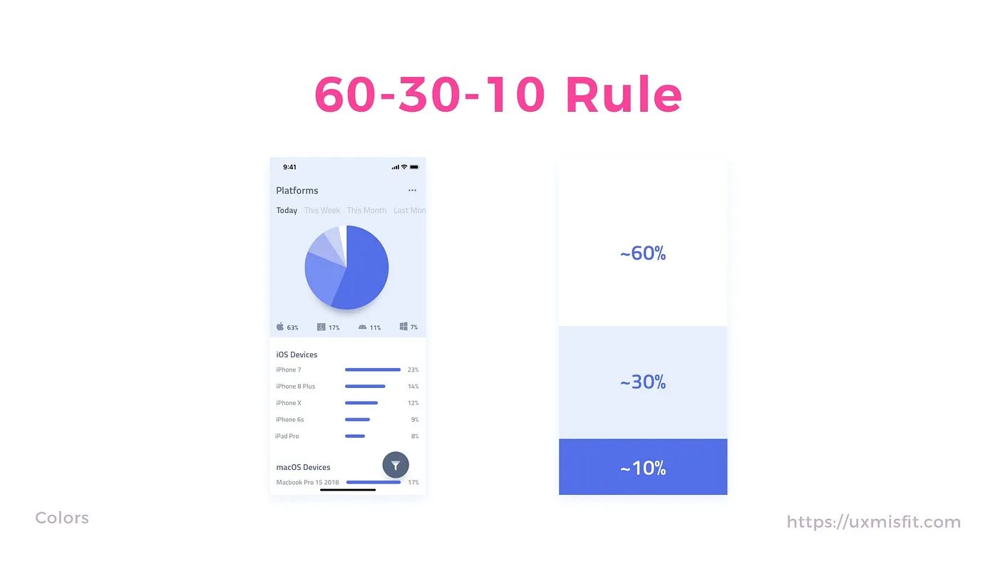 Dưới đây là 1 hình minh họa khá rõ việc chọn màu áp dụng theo quy tắc 60 30 10 trong thiết kế, các bạn có thể tham khảo qua.