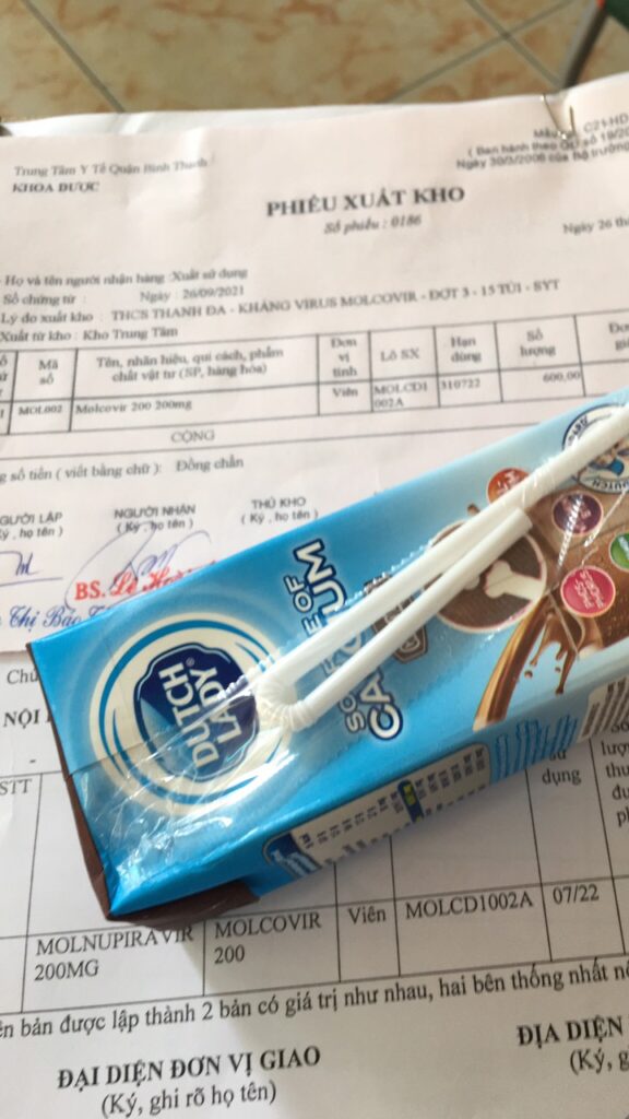 - Nhận thuốc được phân bổ từ Sở y tế, hoặc đôi khi là từ các Mạnh thường quân (đi xe 16 chỗ tới kho của các BV, công ty và nhận đồ về; có chỗ tận Nhà Bè, đi đi về về là hết cả 1 buổi).