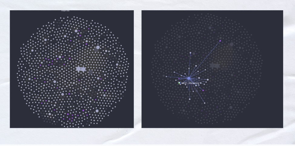 Đây là Graph View hiện tại của Obsidian Vault của mình, các bạn có thể thấy bên trái hiển thị các trang có liên kết tới trang “MOC-Marketing” của mình