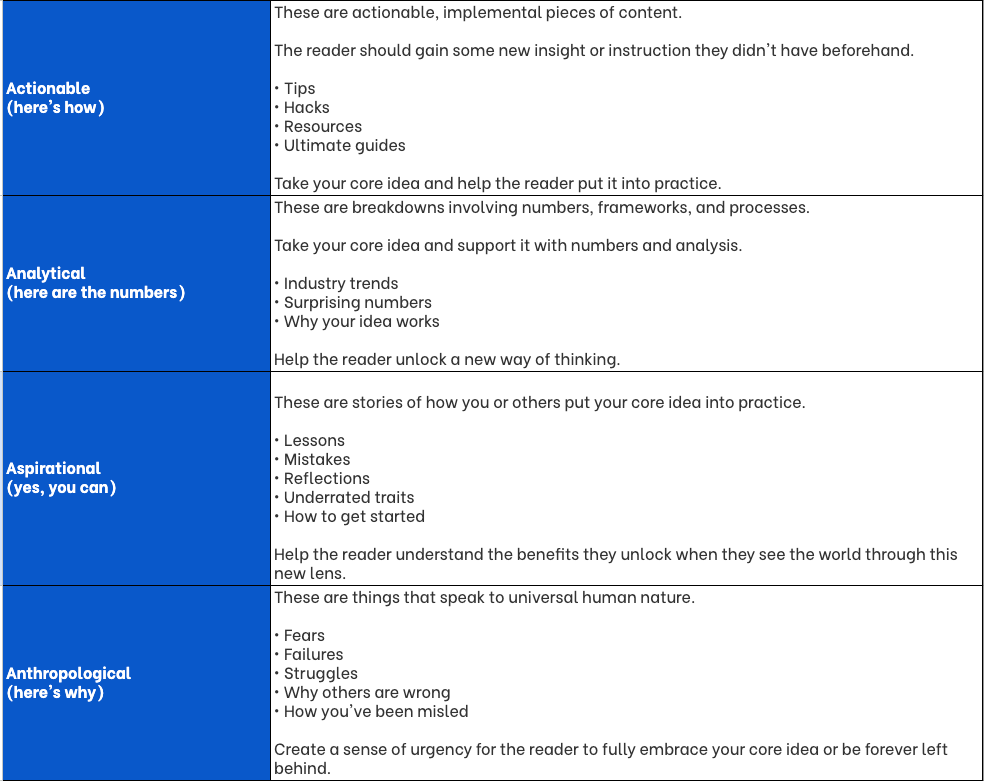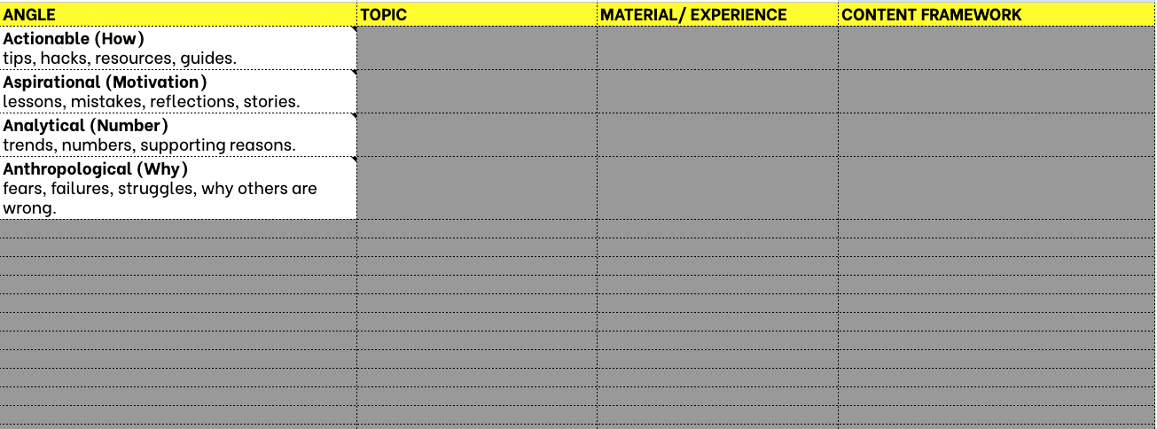 Cột đầu tiên là bốn content angle mà bạn có thể triển khai, chi tiết như nội dung phía trên mình có mô tả.